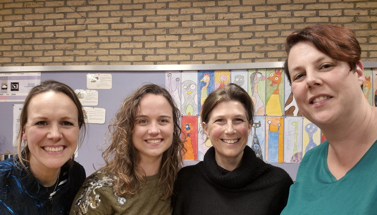 Dit schooljaar (2025-2026) bestaat de MR uit (van links naar rechts): Anneloes Leijenhorst (ouder), Kim Elzinga (leerkracht), Saskia Mensonides (leerkracht) en Tesse Bensdorp (ouder).